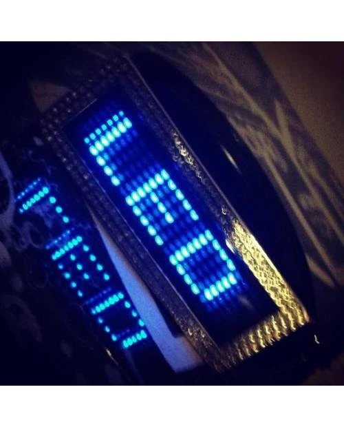 Cette ceinture bleue faite à la commande par notre designer n’aurait pas grande utilité sans ses leds. Choisissez leur vitesse, leur luminosité, ou encore leur genre d’animations. Diffusez les idées que vous avez envie, entre autres via des caractères peu ordinaires (dollars, cœurs remplis, soleils…). On peut retenir 8 textes de 512 caractères sur cette ceinture. C’est comme envoyer un texto, puisque de mini boutons sont présents derrière l’écran led. Une feuille d’explications en langue française vous sera malgré tout fournie avec le produit, par précaution.