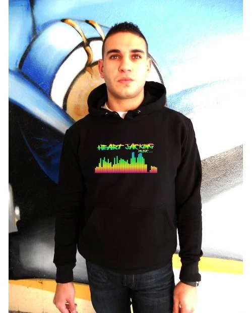 Sweat Music. Suite au succès du Tee shirt equalizer mister DJ, Heart JacKing réitère l’experience avec le sweat Music. Matière Sweat Music : 100% coton, tissu de couleur Noir. Sweat Music col rond, manches courtes. Impression du logo Music centré sur la poitrine. Le Sweat Music est disponible de XS à XXL.