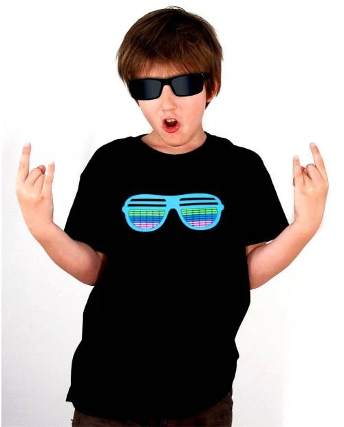 Muni d’un capteur sonore par défaut, ce tee-shirt est un concept exceptionnel : il s’illumine sur le rythme du son ! Claper des mains suffit au tee-shirt Glasses pour s’illuminer ! La luminosité peut se voir même en journée, pas seulement dans la nuit.