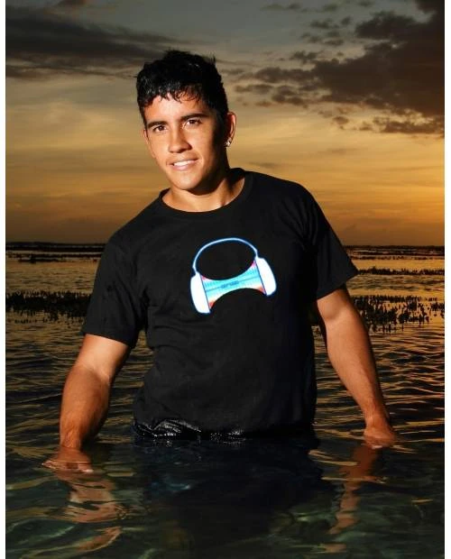 Equipé d’un microphone intégré, et de leds de qualité, légères et solides, ces t-shirts lumineux sont une belle innovation : ils s’animent selon le son ! Taper des mains suffit à ce t-shirt Casque DJ pour briller ! La lumière peut se voir en journée, pas seulement dans le noir. Deux types de mouvements sont possibles, de par notre système de fiches qui se tournent ! Heart JacKing HJK est le seul à offrir ça.